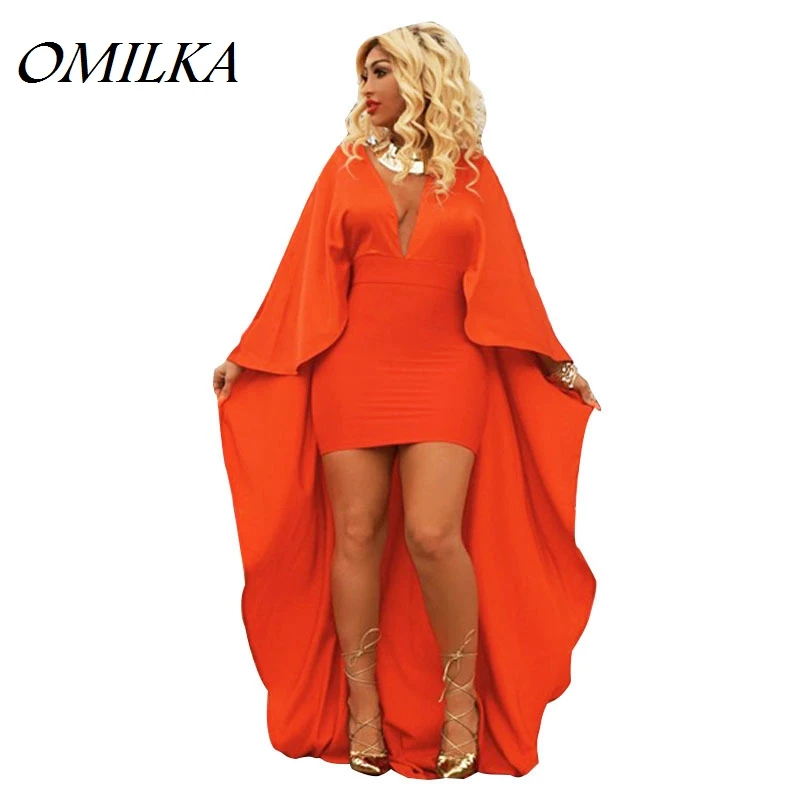 Best OMILKA 2017 Summer Women Long Sleeve Cape Party Bodycon Dress Sexy Orange Front Short Back Long Club Party Dress Vestidos offers