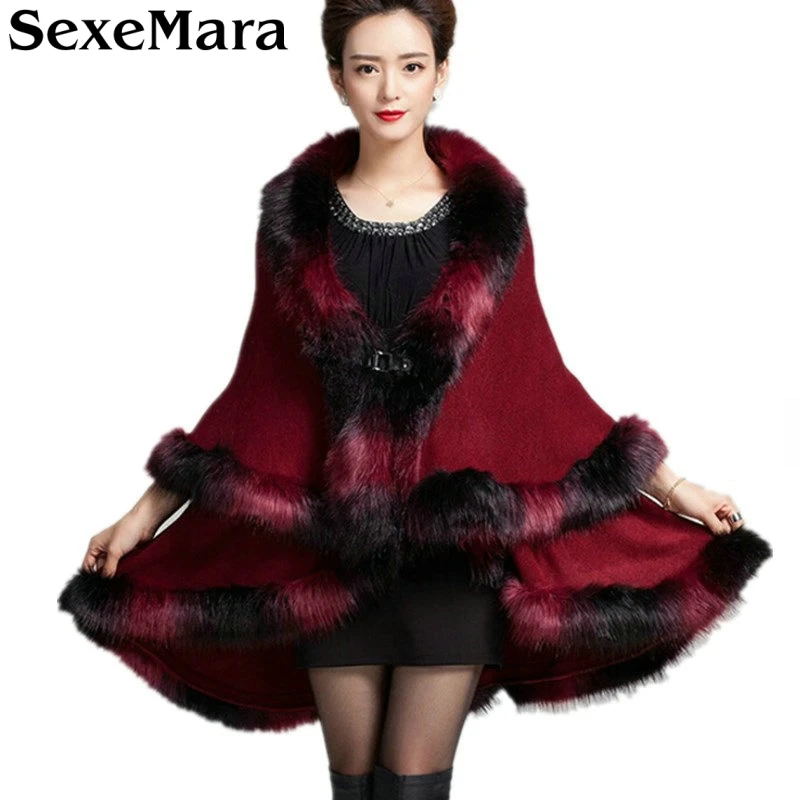 Good 2016 Autumn Winter Warm Fake Fox Fur Long Knitted Poncho Cape Cloak Oversize Wool Cashmere Sweater Women Cardigan Coat MY38 offers